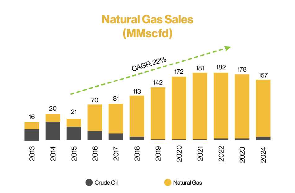Starting in 2012 Canacol shifted from being predominantly oil-focused, to being purely gas-focused today. Via our successful exploration drilling programs, and our ability to efficiently commercialize new gas reserves, we have grown gas sales more than 10x from 2012. Our sales guidance for 2025 is between 140 - 153 million standard cubic feet per day. Our sales growth has been possible by developing and/or sponsoring new gas transportation infrastructure, creating a significant competitive edge over potential competitors.
